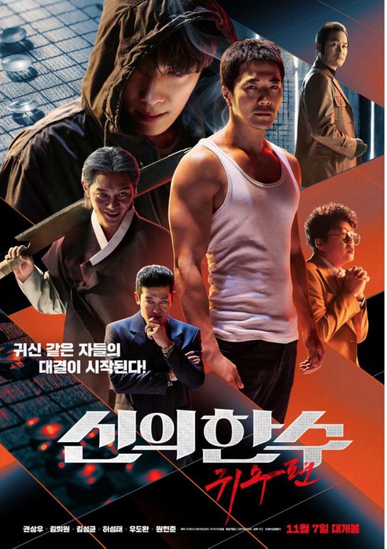 영화 신의 한 수는 바둑을 소재로 한 영화로 바둑용어 나오기 하지만 영화 볼 때 큰 어려움 없으며 2014년 개봉 한 배우 정우성. 이범수, 안성기, 김인권 주연 출연 하셨고요 신의 한 수 귀수 편 후속작 두 번째 이야기 2019년 작품으로 범죄 액션 장르 관객 수 215만명 손익분기점 230만명 조금 부족했죠. 재미는 취향에 차이가 있어요. 출연진 > 귀수역[ 권상우] 억울하게[ 죽음을 당한 스승님 규친누나 복수를 위해서 바둑판 세계 입문 똥선생 [ 김희원]